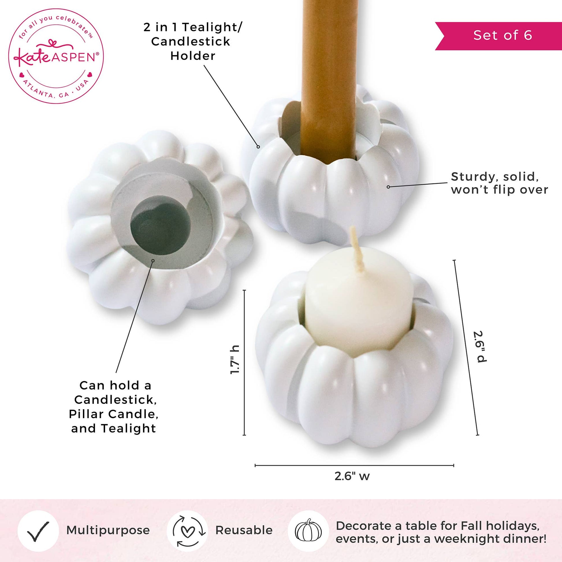 Do you love candles as much as we do? We may be a little bit obsessed, but with candles come candle holders and we have created the perfect candle holder for the season. The White Pumpkin 2-in-1 Tealight/Candlestick holders come in a set of six and can be used in so many ways. With the fall season approaching and so many events to host and so many spaces needing to be decorated for the season; these little gems can be used all over the house. They make an elegant addition to a Thanksgiving tablescape. With the two different sizes of holes, you can add dimension, light, and beauty without obscuring the faces across the table. The top hole is wide enough to hold a tealight or small pillar candle, while the bottom hole is perfectly sized for a candlestick.