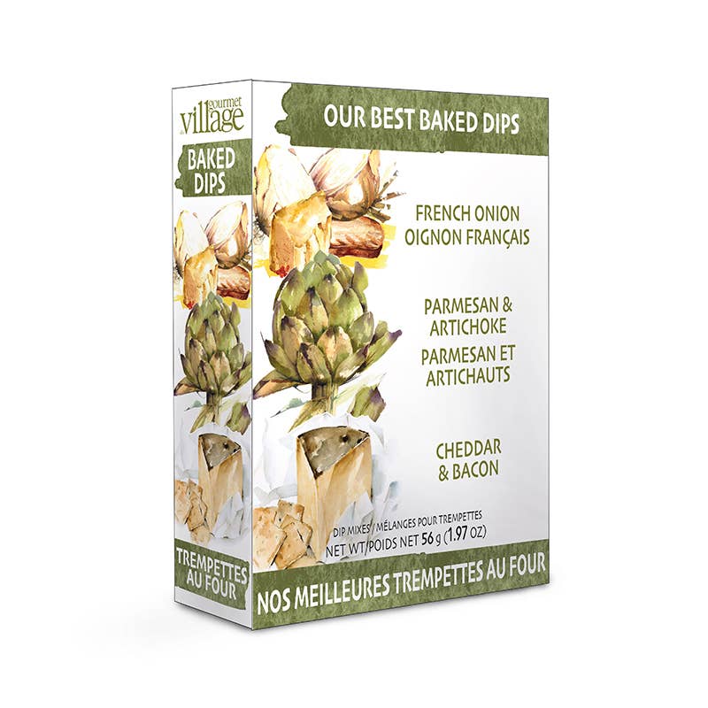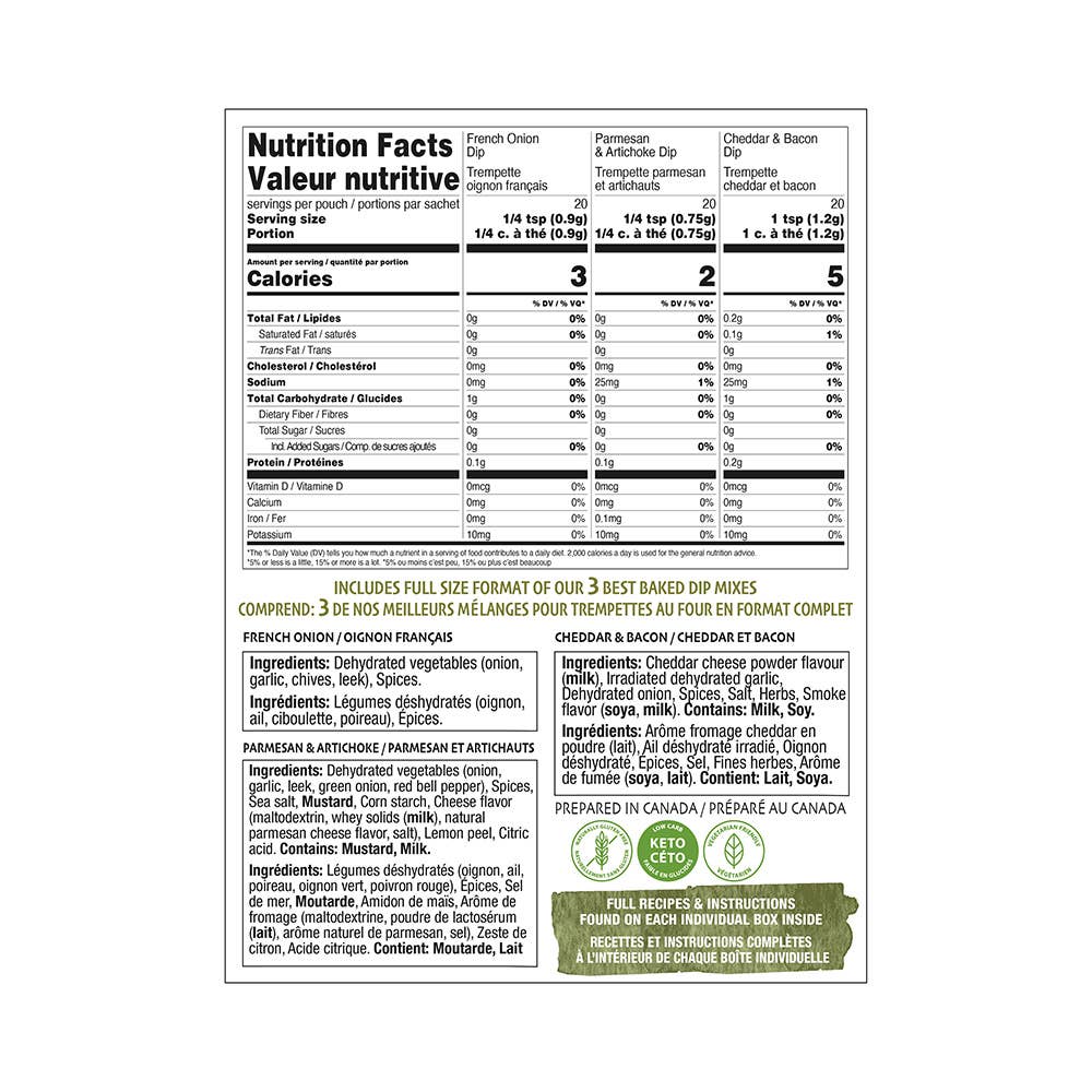 Baked Dip Trio. Includes Parmesan & Artichoke, Cheddar & Bacon, and French Onion, three of our very best Baked Dips bundled into a "trio." Each recipe box makes 2-3 cups of delicious dip, for a total of 6-9 cups per Dip Trio!