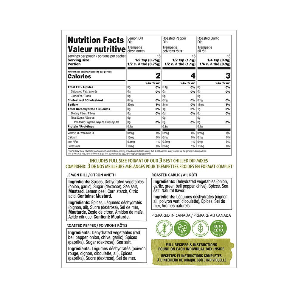 Chilled Dip Trio. Includes Roasted Garlic, Lemon Dill and Roasted Pepper, three of our very best chilled dips bundled into a "trio". Each recipe box makes 2-3 cups of delicious dip, for a total of 6-9 cups per Dip Trio!