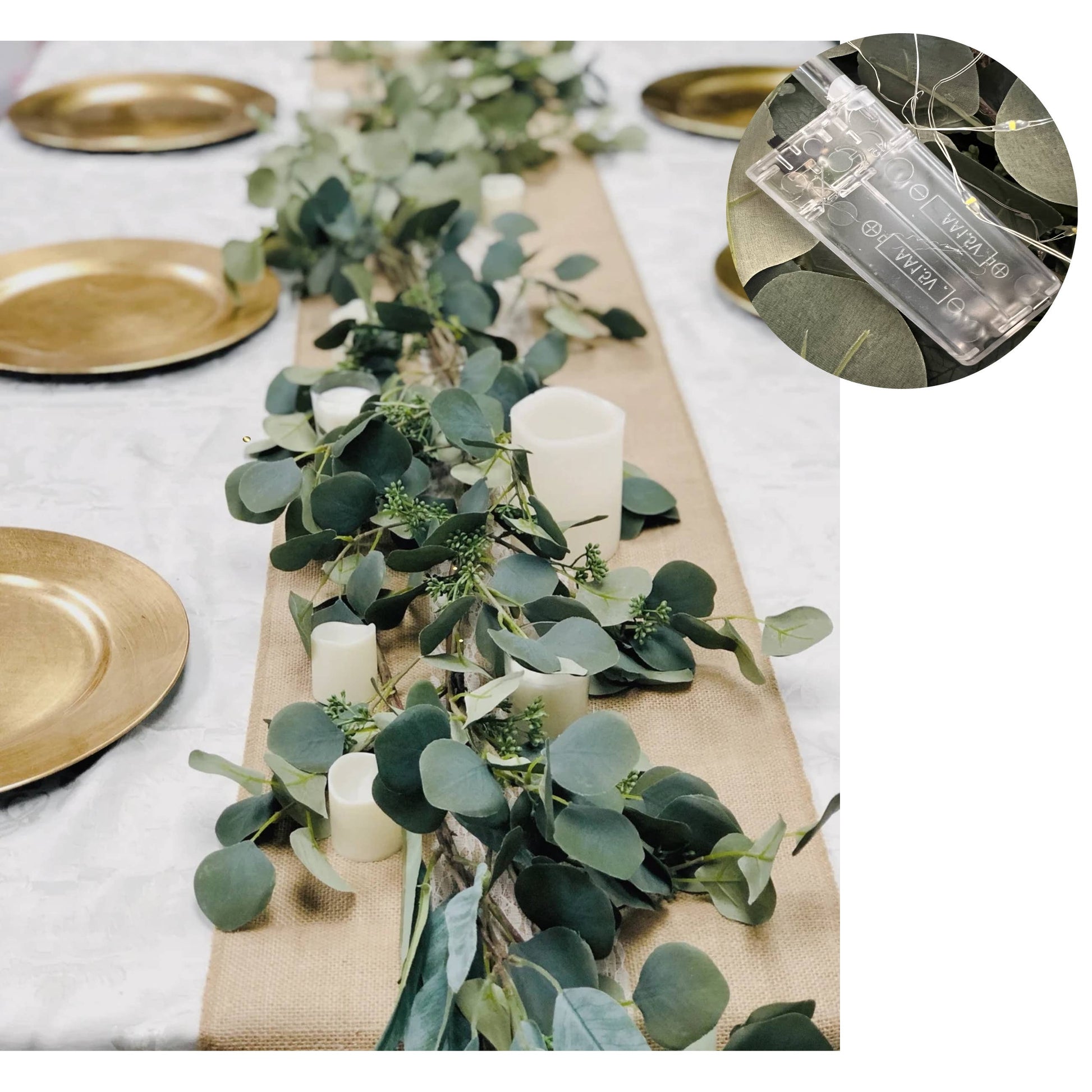 This grey-green eucalyptus garland with seeded accents pairs beautifully with candles for a warm and inviting decor setup. The lifelike, bendable twigs allow for easy shaping around candle arrangements, creating a soft, natural ambiance perfect for weddings, holiday displays, or home decor.