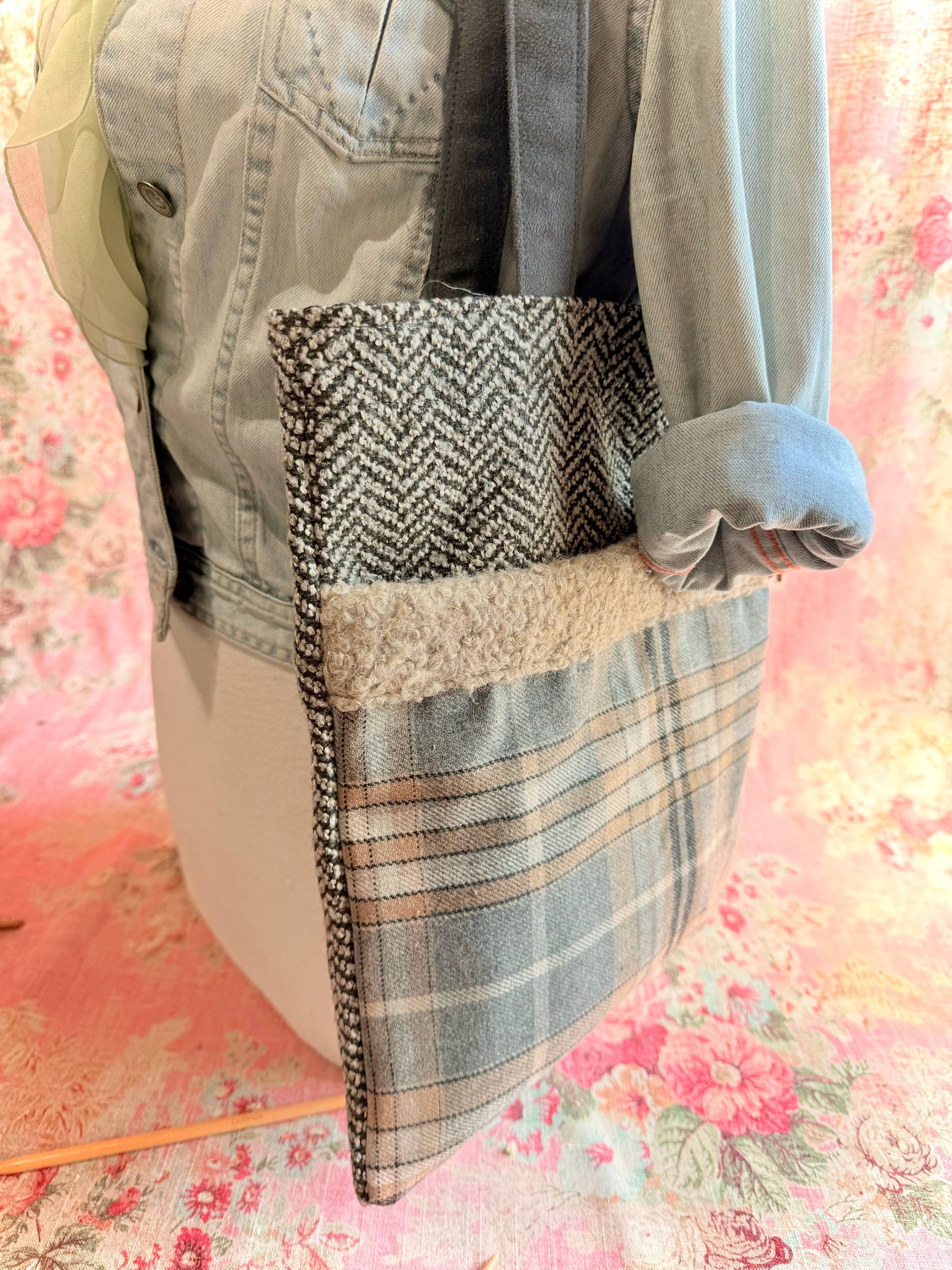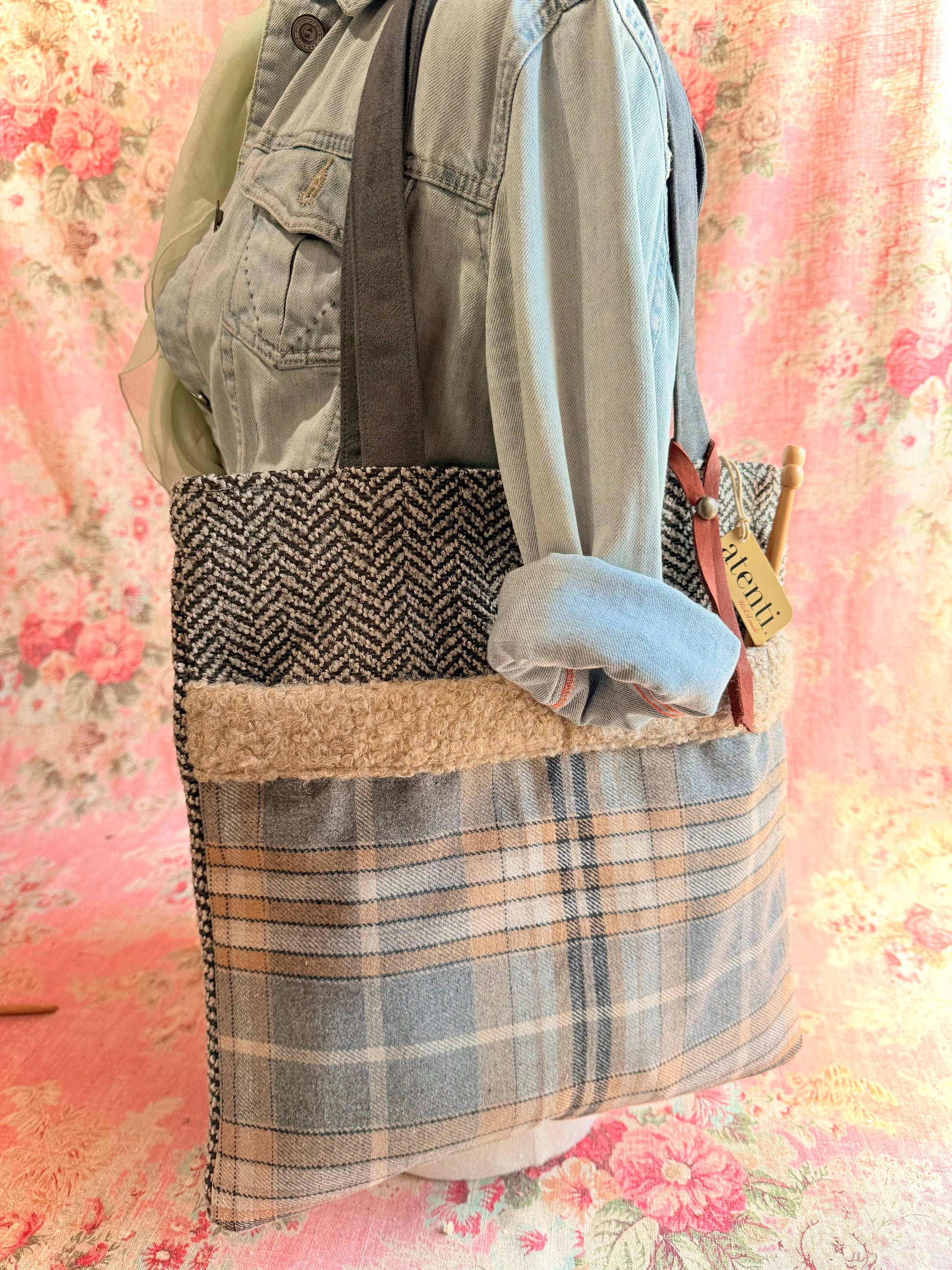 The Atenti Market Bags have a soft tote style design with handles. Each one features a unique combination of fabrics and patterns. These bags are ideal for carrying groceries, books, or everyday items. Dry clean only, recycled content.