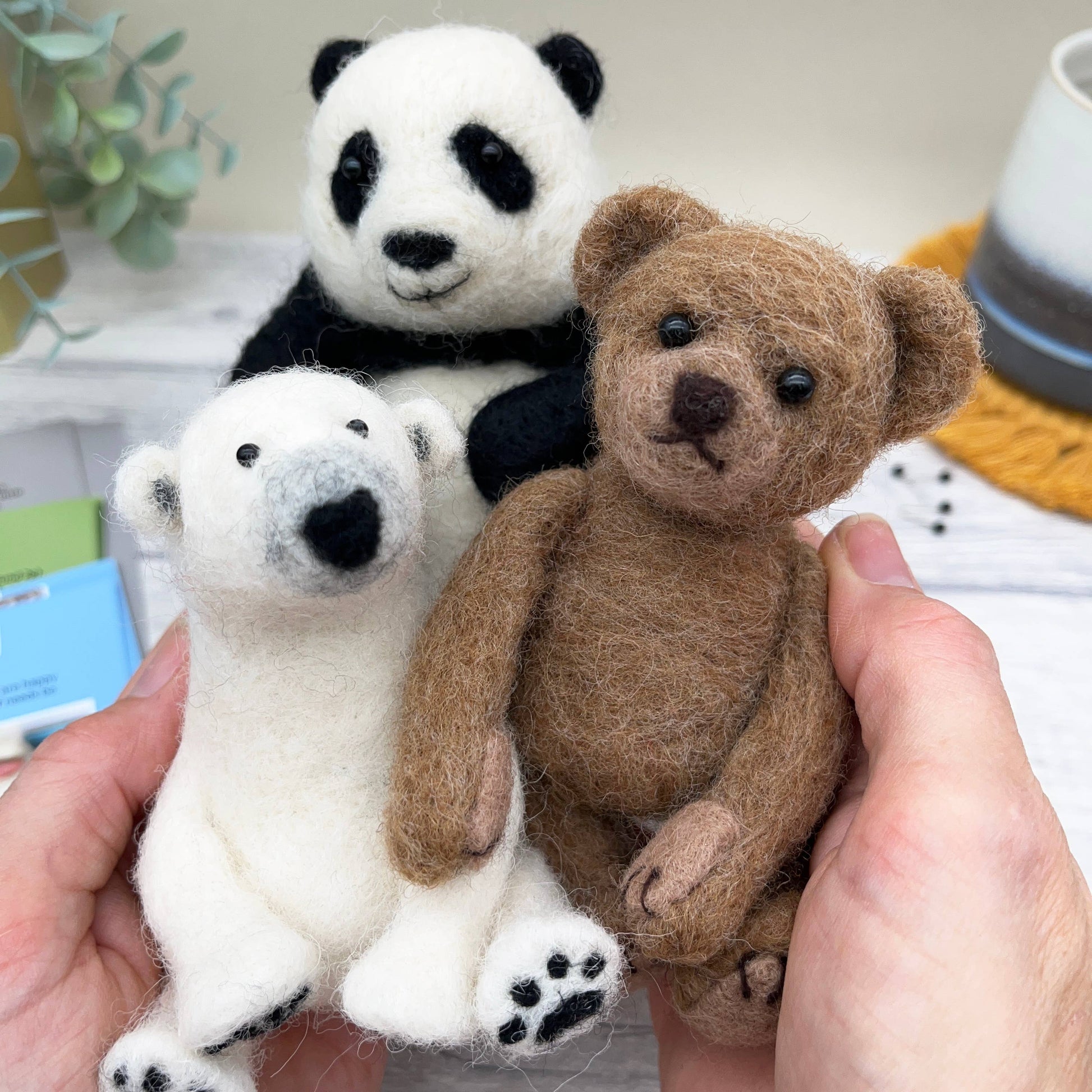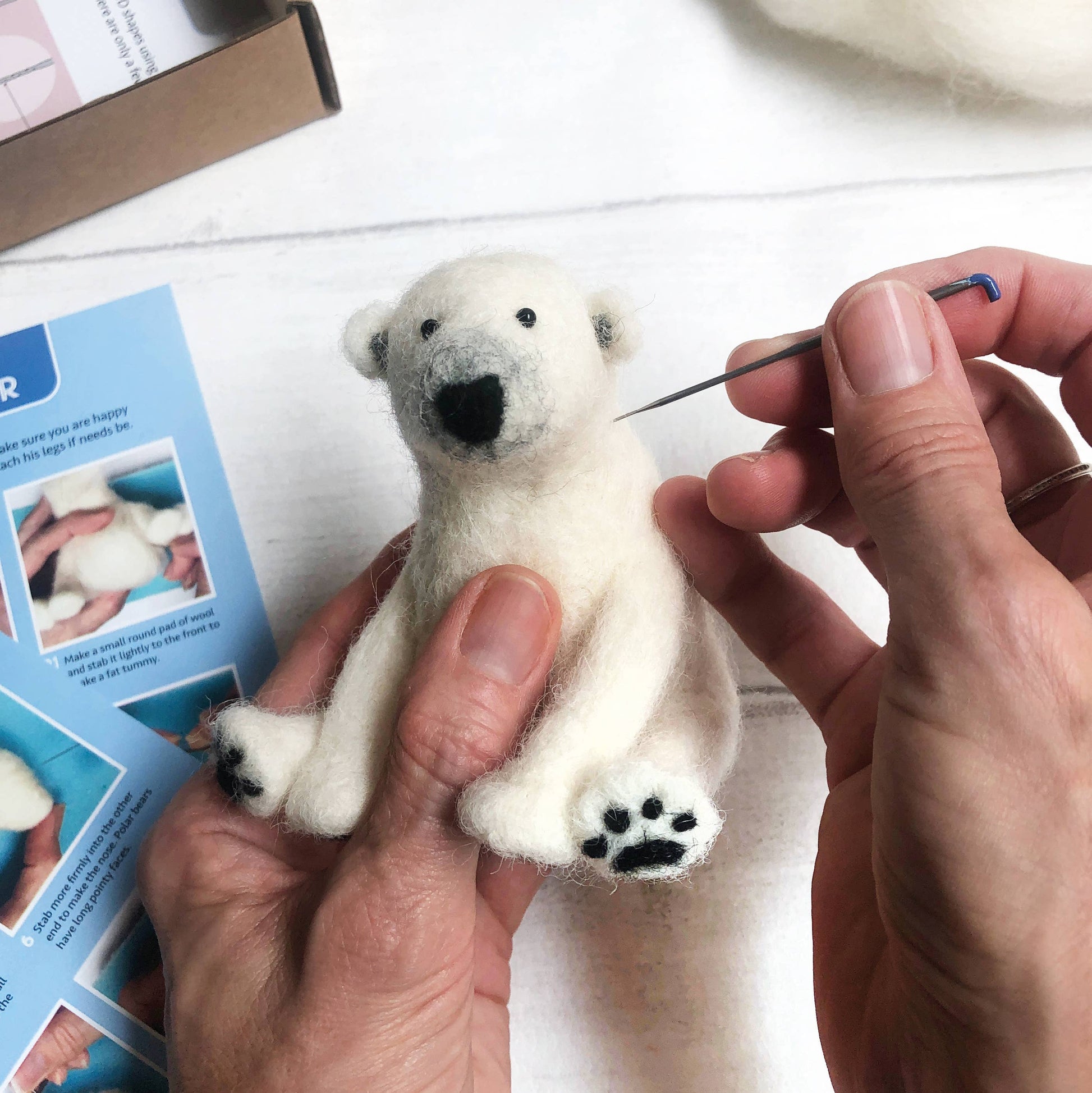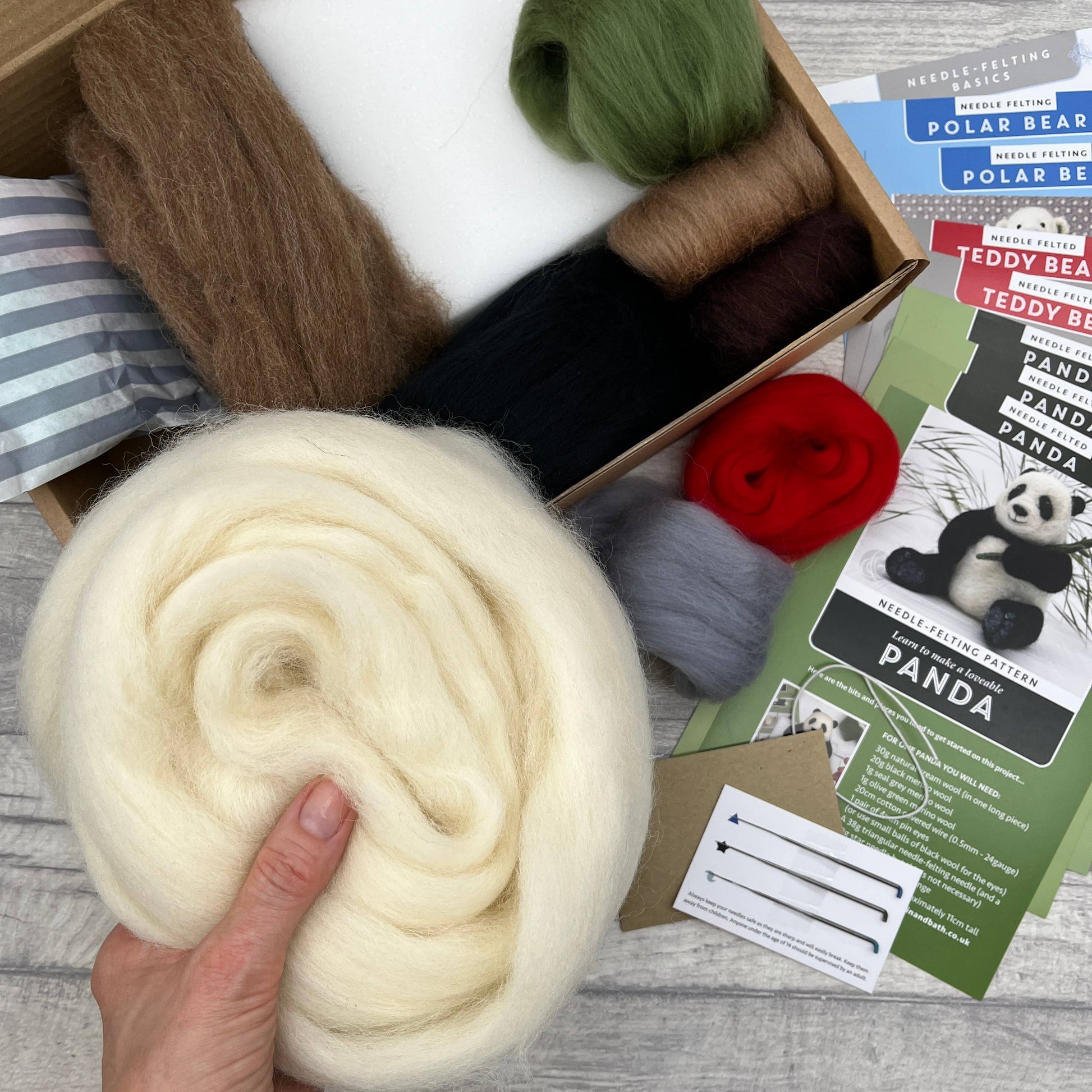 Packaged in a stylish display box, this craft kit for adults contains a beautiful selection of natural wool fibres, eyes, and three sets of step-by-step photographic instructions showing you how to make a polar bear, a panda and a teddy bear. Included in the kit is a felting mat and THREE specialist felting needles so you can get started straight away. This bumper set is suitable for more advanced felters but if you have not needle felted before, you can discover all of our top needle-felting tips contained in our basics guide. You will also find a little goodie bag with a selection of coloured wools so you can make your bears a hat or scarf, let your imagination get to work!