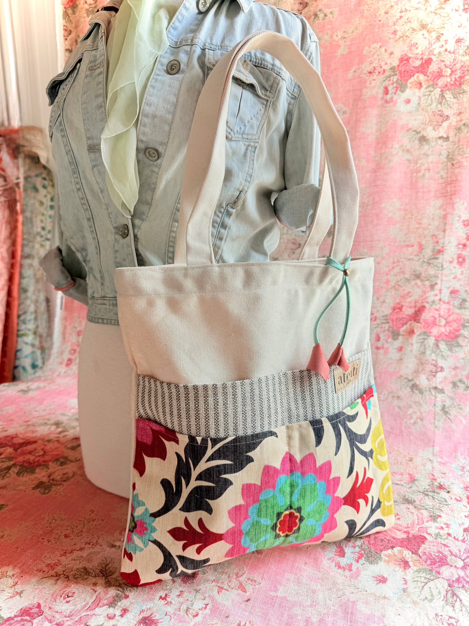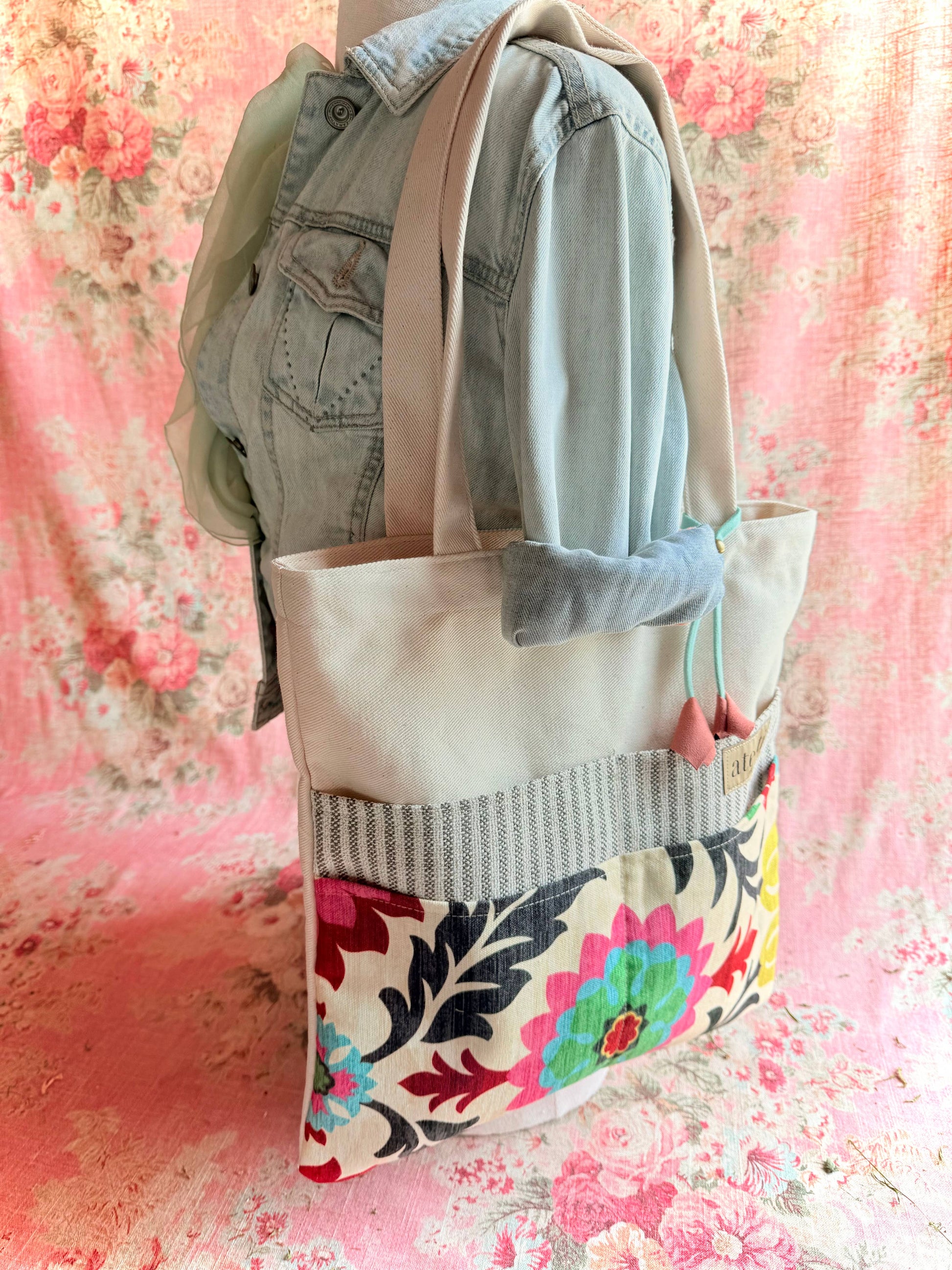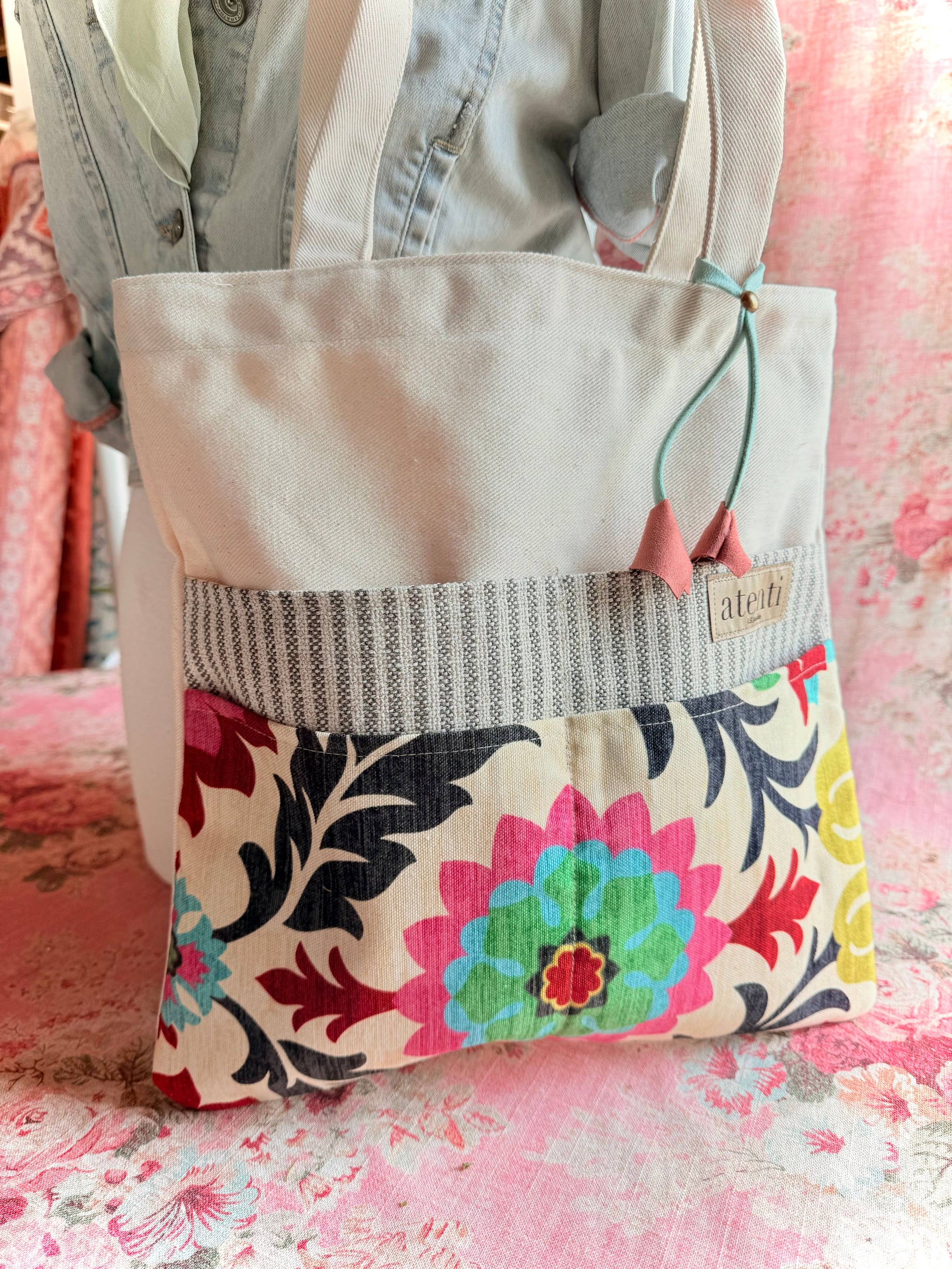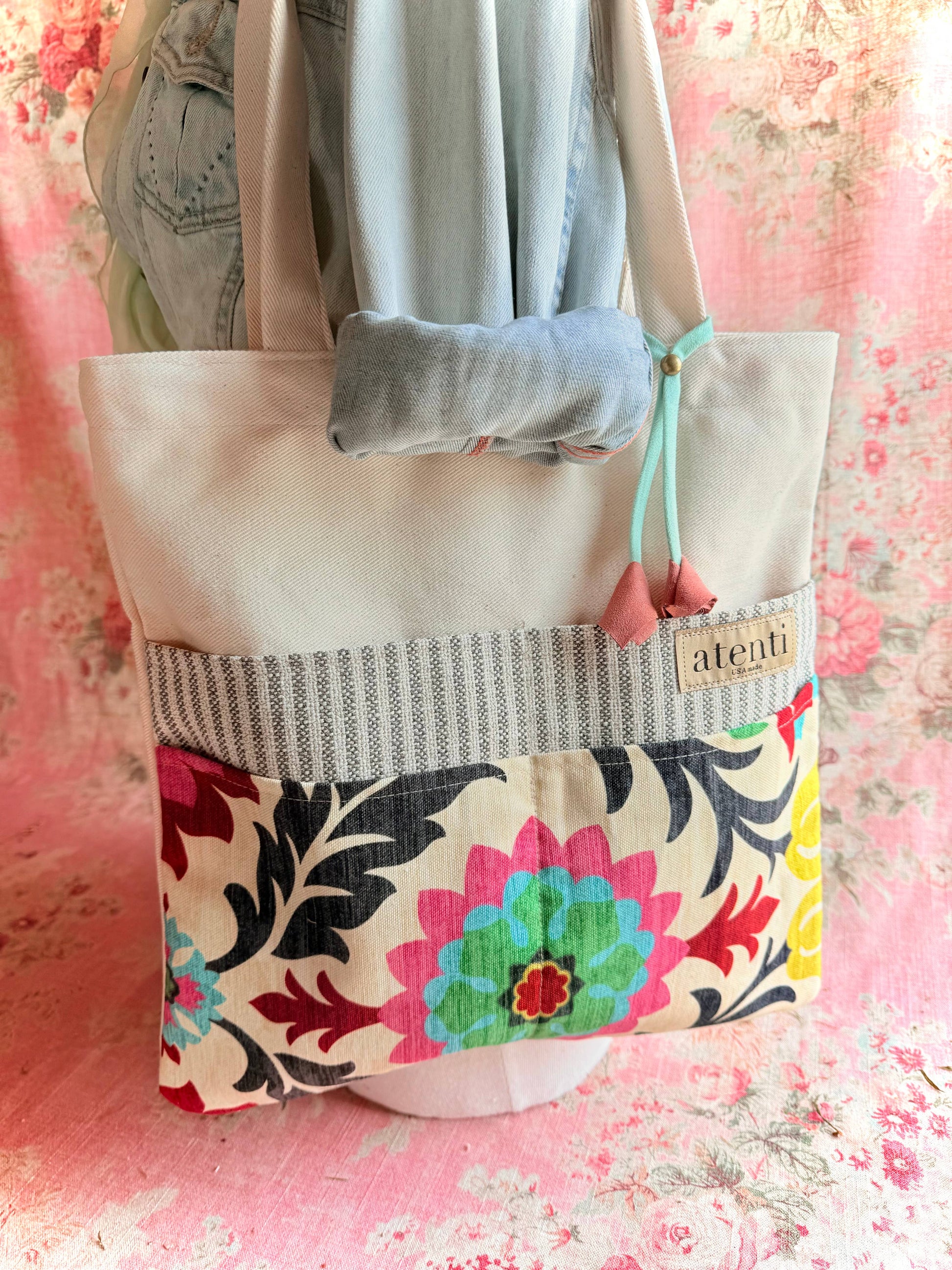 The Blossoms Grey Tutto features a robust texture cotton linen blend printed with a bold floral watercolor design. This bag has a soft tote style design with 4 open pockets on the outside. Each one features a unique combination of fabrics and patterns, non lined. Handles have a 10inch drop, and each design comes with an Atenti, signature, handmade tassel decoration. These bags are ideal for carrying projects, groceries, books, or everyday items, and everyday market bag!