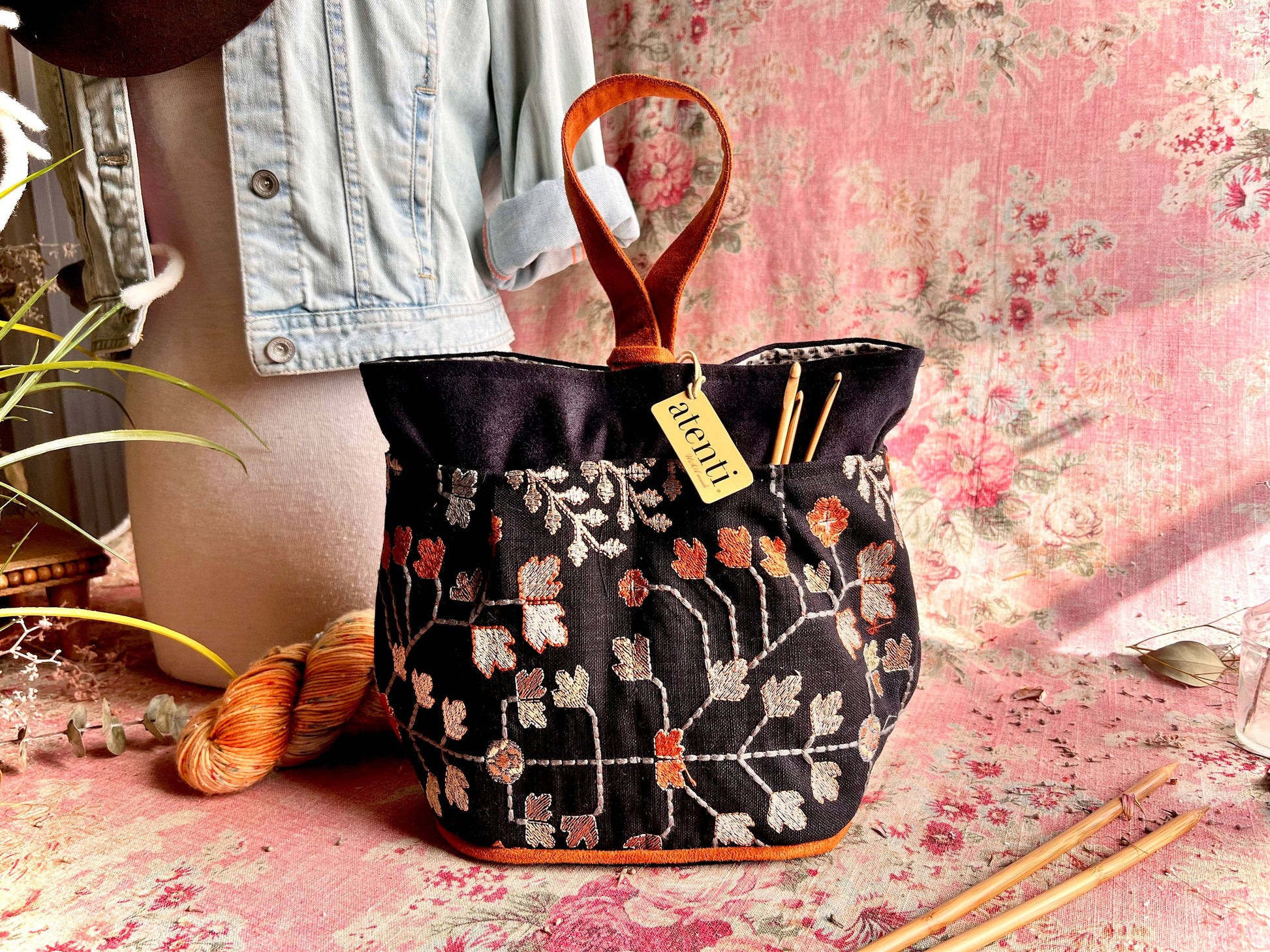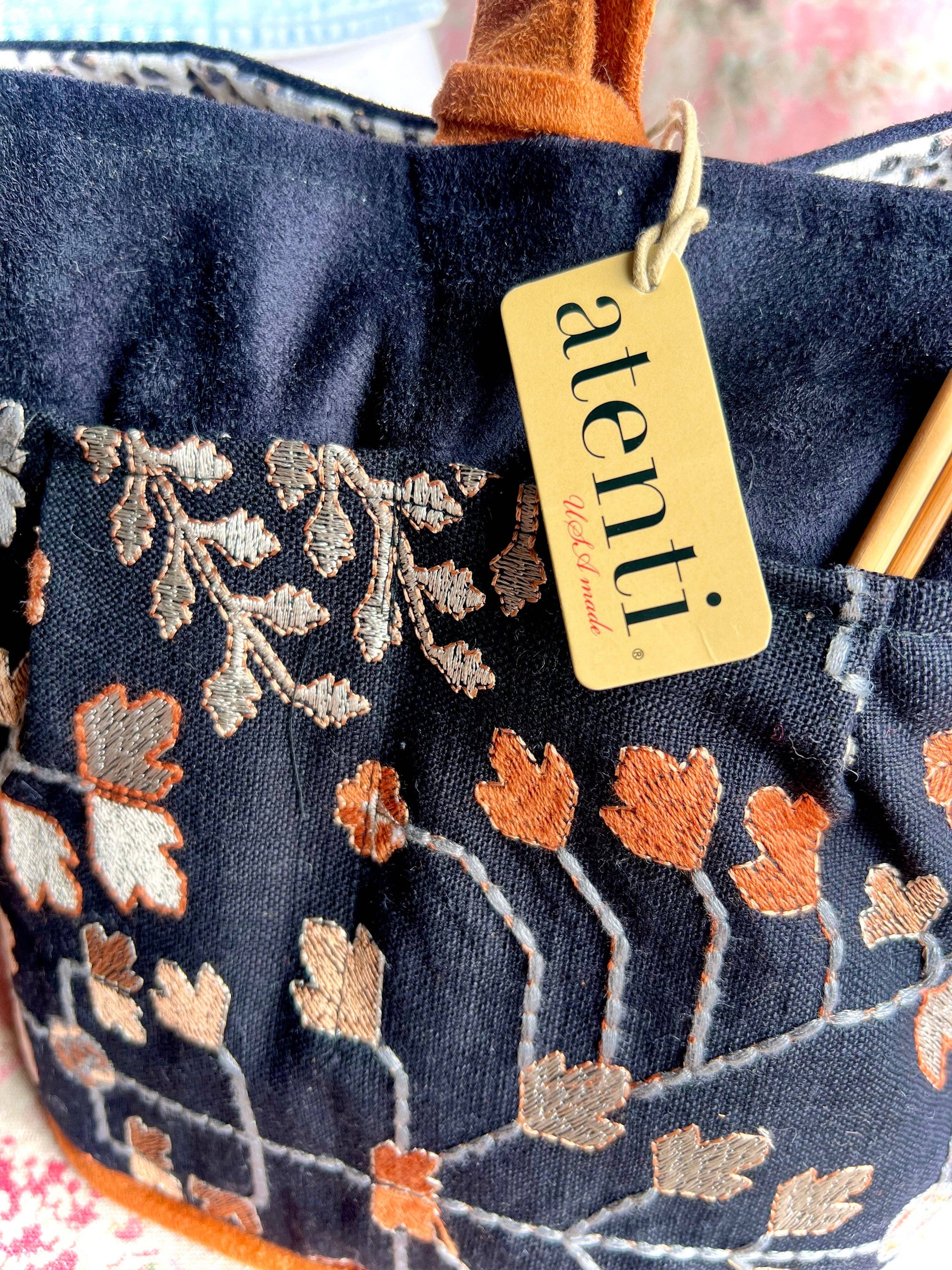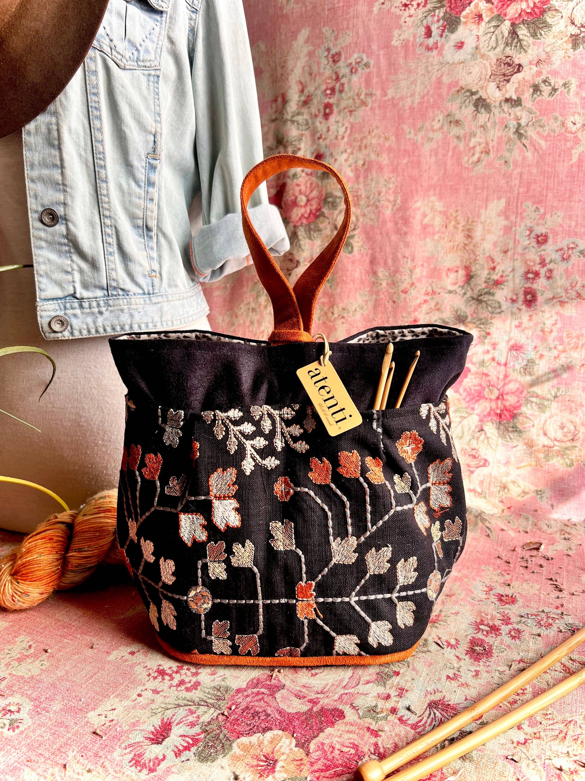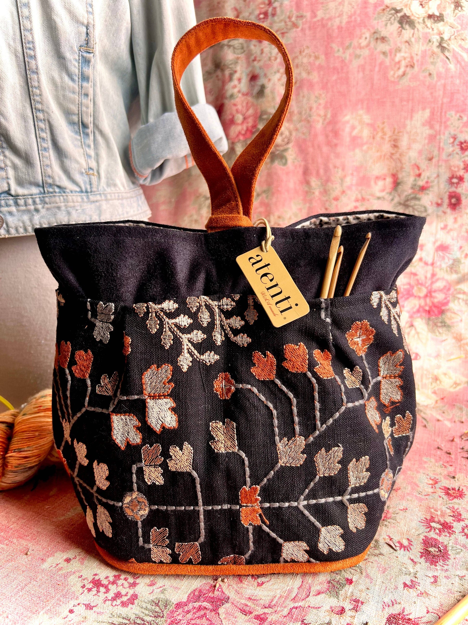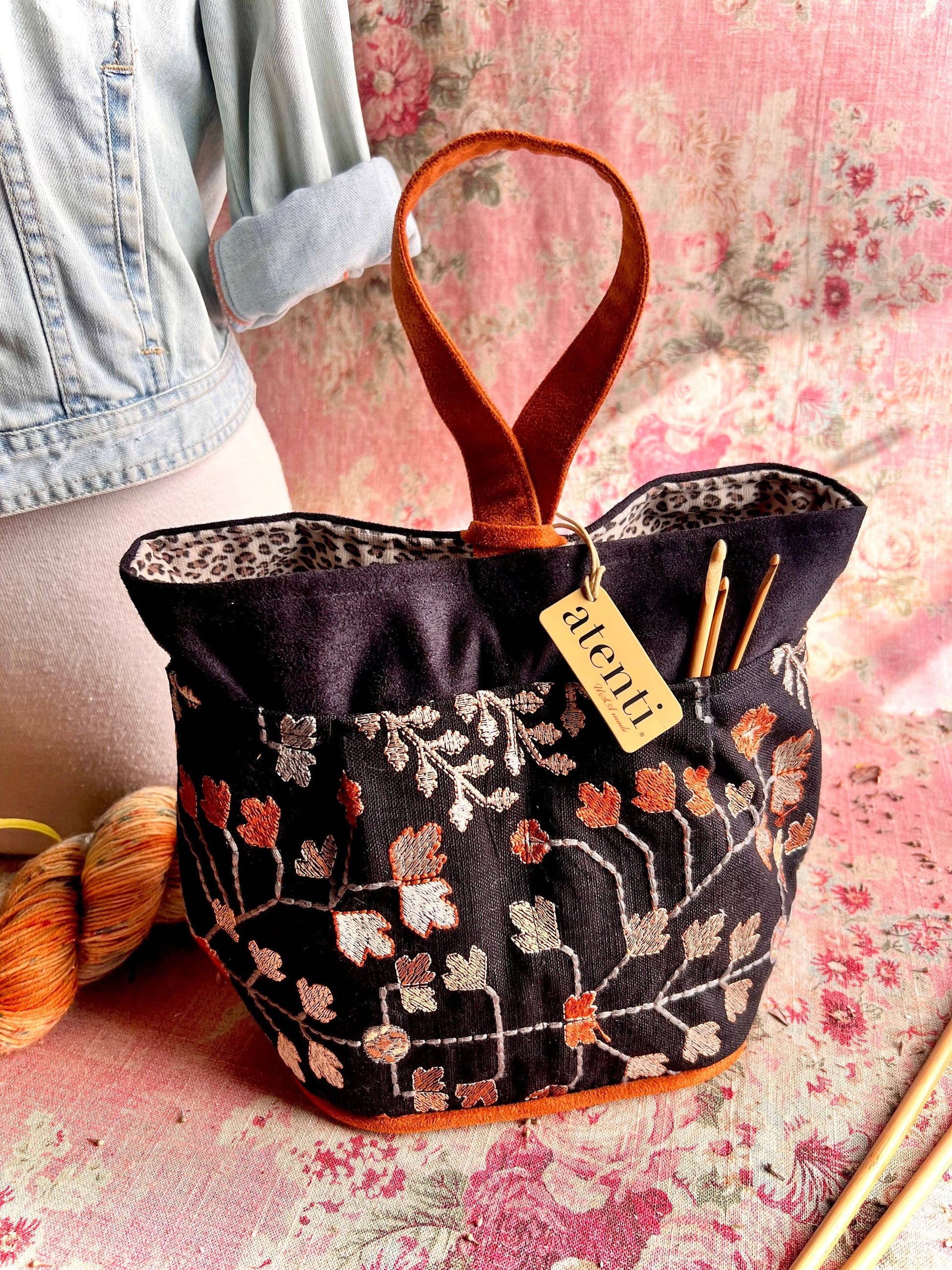 Be awestruck by the beauty of the Twinkle tall Caddy. Its embroidered tapestry-like background of autumnal leaves on a dark backdrop is matched with a twinkling interior fabric, bringing understated elegance and a surprising pop! This taller version of our best selling Caddy, is a stand-alone, carry around organizer and is perfect to store and keep all your tools and notions handy. It’s fully lined and has four outside and four inside pockets with an ample center well. Thread the ultra suede handle through the closure loop to secure and as a carrying option. The Tall Caddy provides storage that is designed to be both efficient and stylish while all of your crafting items will stay organized and secure.