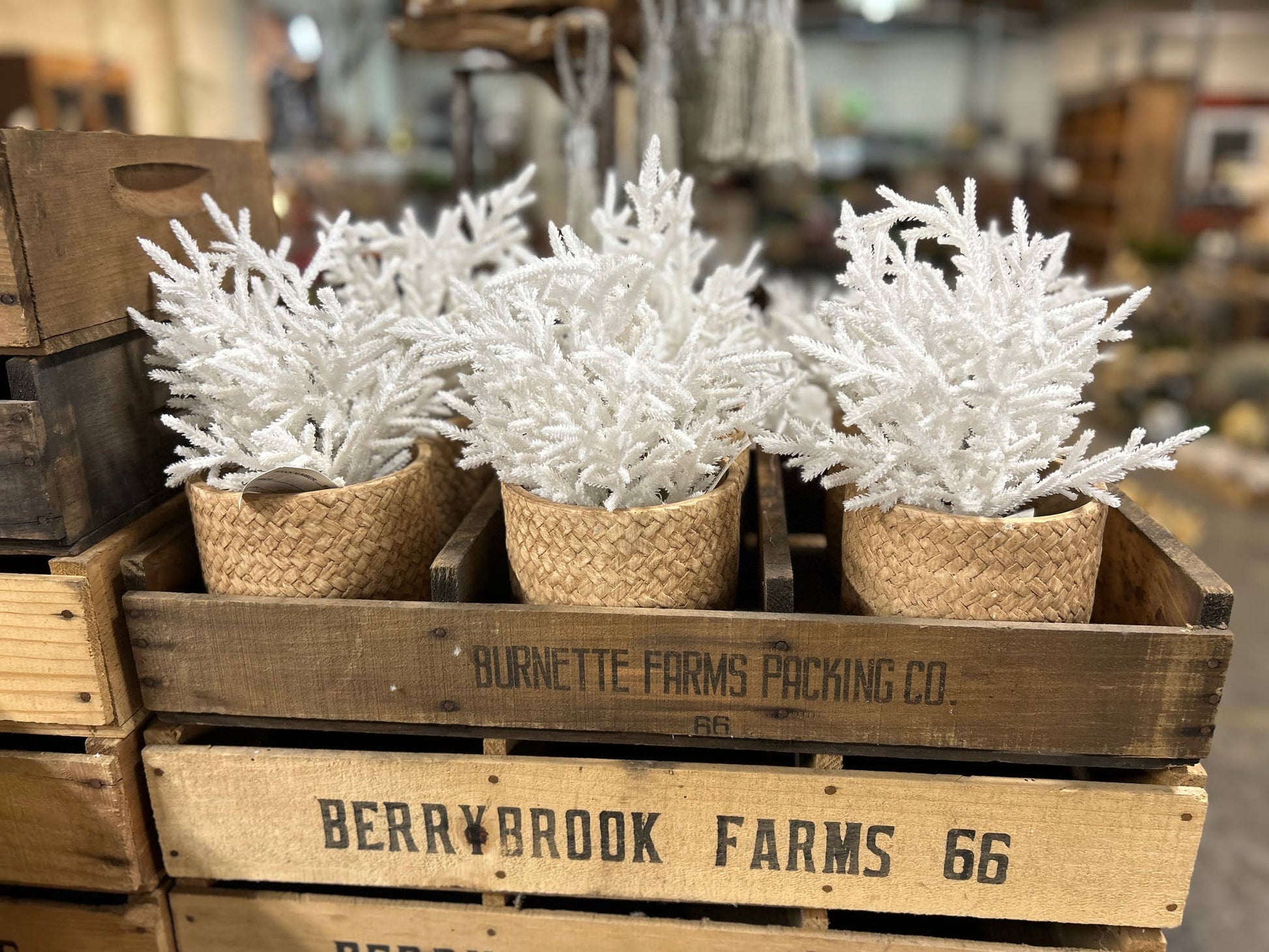 Embrace the all-white aesthetic with a White Shimmer Tree. A simple white ceramic pot features a multi-branched tree with shimmery white frosted branches. So simple, so elegant. These would make a great hostess gift!